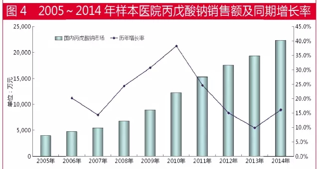 据国内22个城市样本医院数据,2005~2014年,丙戊酸钠一直保持较快增长速度。自2005年以来,该产品在抗癫痫类用药领域销售额一直名列前茅,复合增长率为21.2%。2005年,样本医院丙戊酸钠用药金额为3697万元,到2014年,用药金额达2.2亿元,9年整体市场增长5.6倍。