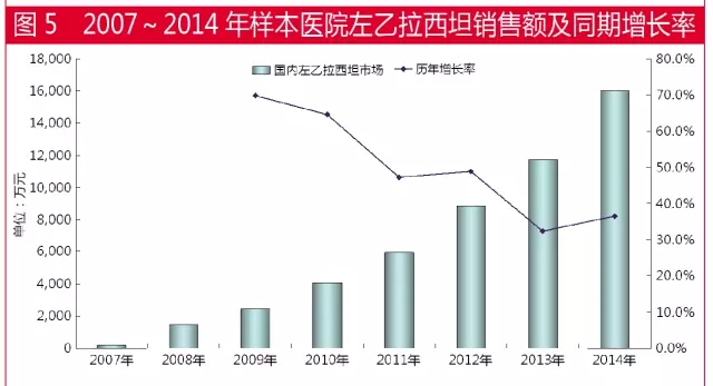 据国内22个城市样本医院数据,2007~2014年,左乙拉西坦一直保持较快增长速度。自2011年以来,该产品在抗癫痫类用药领域销售额已上升为第2位,复合增长率高达为36.5%。2005年,样本医院左乙拉西坦用药金额为178万元,2014年用药金额达1.6亿元,7年里整体市场增长了90倍。