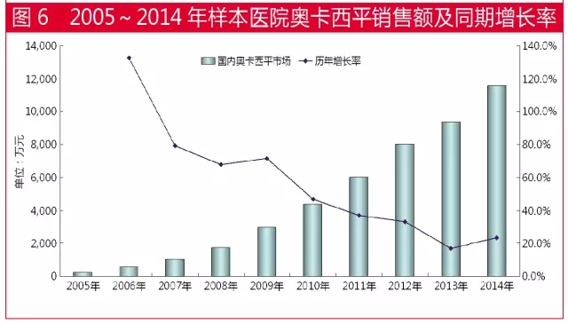 据国内22个城市样本医院数据,2005~2014年,奥卡西平一直保持较快增长速度。自2012年以来,该产品在抗癫痫类用药领域排名第3位,复合增长率为53.2%。2005年,全国样本医院奥卡西平用药金额为249万元;2014年用药金额上升至1.2亿元;9年整体市场增长46.5倍。