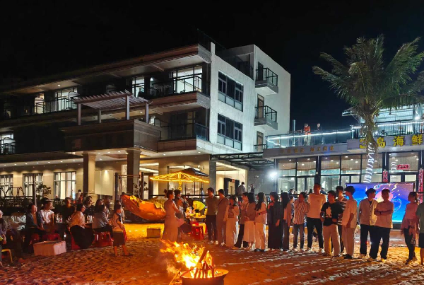 After dinner, everyone gathered around the bonfire. Classic songs rose with the gentle sea breeze, followed by rounds of interactive games: from默契-testing collaborative challenges to individual talent showcases, culminating in hand-in-hand dancing around the flames.